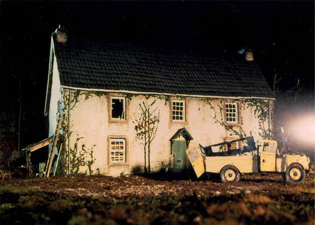 The film ends with a massive explosion that destroys the Scottish farmhouse. I felt this best achieved as a scale model. A perfect 3ft (1m) high replica was built in the Luxembourg studios of the house, the surrounding forest and half destroyed yellow Land Rover outside. Five cameras caught the explosion, some over-cranked to show the event in slow-motion. Dynamic angles were chosen to increase the drama to the extent of some debris hitting the camera lens.